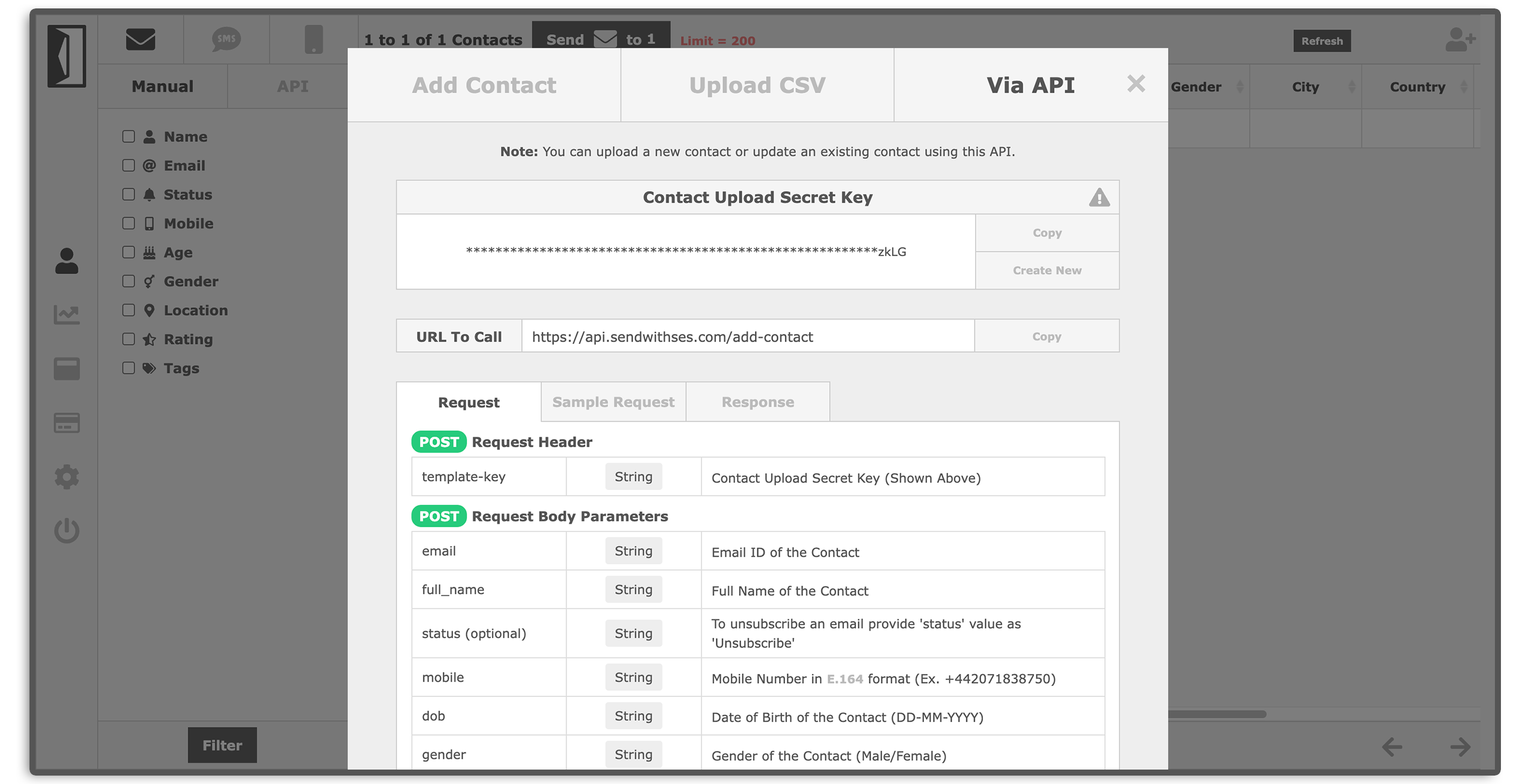* All API calls MUST include the **Contact Upload Secret Key**.